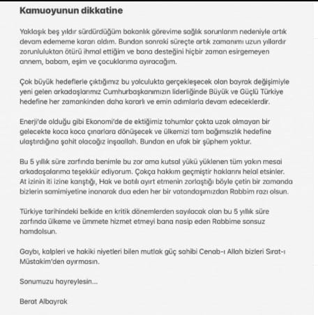 "Yaklaşık beş yıldır sürdürdüğüm bakanlık görevimi sağlık sorunlarım nedeniyle ortık devam edemem kararı aldım" denilerek Berat Albayrak'ın Instagram hesabına konulan açıklama şöyle: