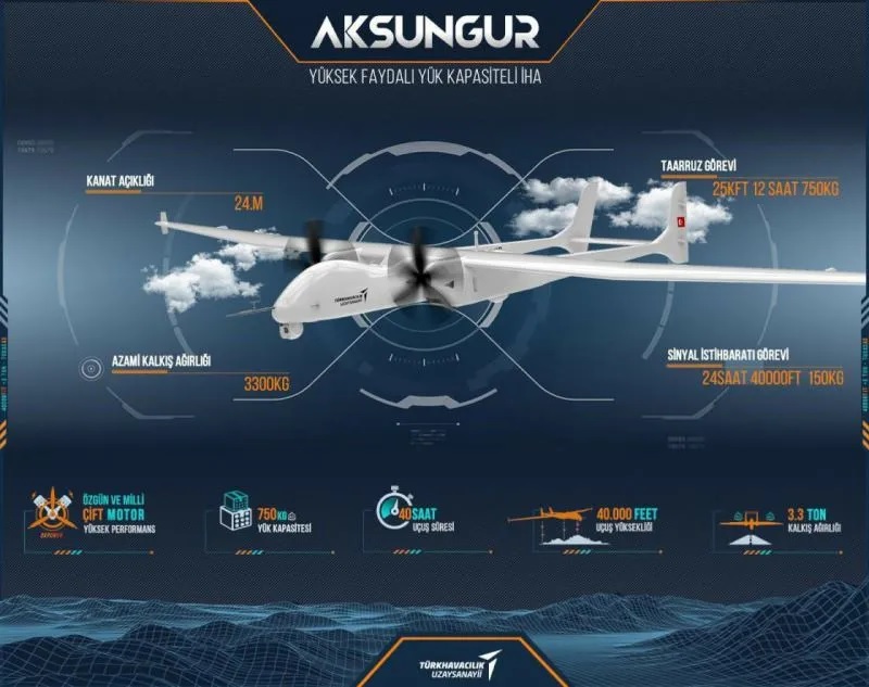 40 bin feet irtifaya çıkabilen ve 40 saate kadar havada kalabilen Aksungur, en zorlu operasyonların tamamlanabilmesine imkan veren motor yapısına da sahip bulunuyor.