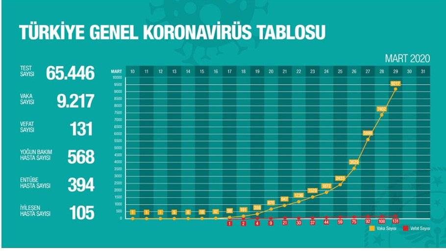 Ortadoğu ülkelerinden gelen bazı vatandaşlarda, Umre'den dönen bazı vatandaşlarda, Avrupa ve Amerika Birleşik Devletleri'nden gelen bazı vatandaşlarda corona virüs tespit edildi. Ülkemizde corona virüs testi pozitif çıkan 9217 vaka olduğu açıklandı.