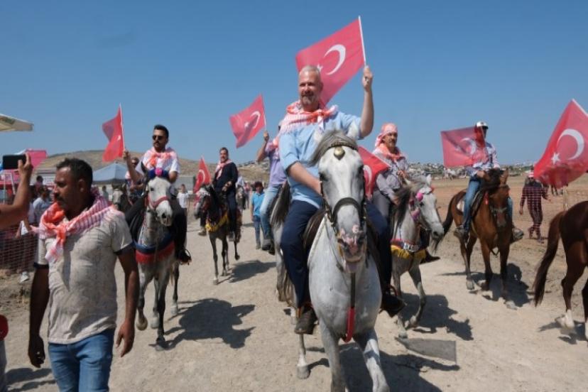 Yarışmaların yapılacağı alana elinde Türk bayrağıyla at üzerinde gelen Başkan Vekili Pehlivan, vatandaşların alkışları eşliğinde turunu tamamladı.