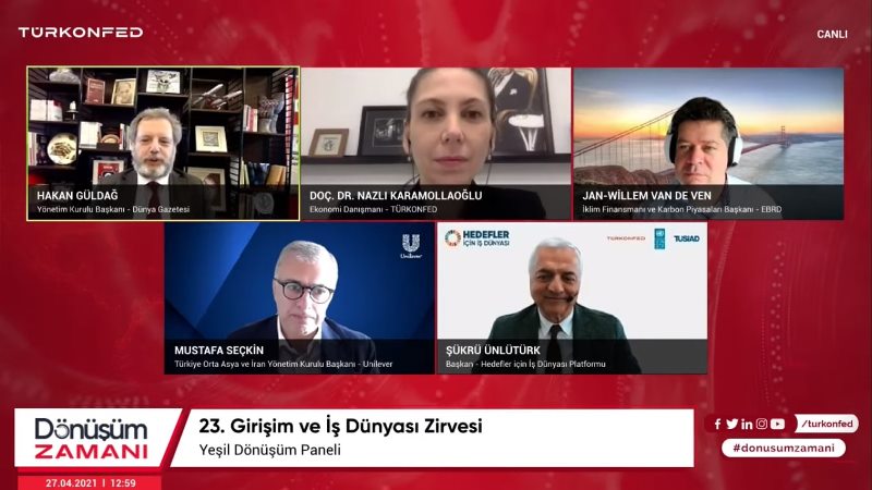 27 Nisan 2021/İstanbul –Türk Girişim ve İş Dünyası Konfederasyonu’nun (TÜRKONFED), bu yıl 23.’sünü düzenlediği Girişim ve İş Dünyası Zirvesi, 27 Nisan 2021 Salı günü “Dönüşüm Zamanı!” ana temasıyla gerçekleşti. Kamu, iş dünyası ve uluslararası alandan isimlerin bir araya geldiği çevrim içi zirvede, ikiz dönüşüm olarak da adlandırılan yeşil dönüşüm ve dijital dönüşüm temalı birer panel düzenlendi.