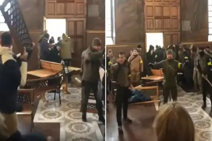 Görgü tanıklarının aktardığına göre, her iki grup birbirine sopalar ve taşlarla saldırdı. Sandalyeler havada uçuştu, yangın söndürücüler silah gibi kullanıldı ve göz yaşartıcı gaz bombaları atıldı. Kavga sırasında piskoposun başlığının fırladığı, silahların gösterildiği ancak kullanılmadığı belirtildi.