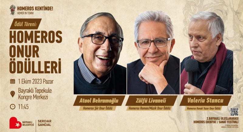 Bu yıl ‘Homeros Kentinde’ sloganıyla gerçekleşecek festival, Türk ve dünya edebiyatının değerli isimlerine ev sahipliği yapacak. Volkan Severcan’ın sunumuyla gerçekleşecek festival kapsamında Zülfü Livaneli’ye Homeros Roman/ Müzik Onur Ödülü, Ataol Behramoğlu’na Homeros Şiir Onur Ödülü, Valeriu Stancu’ya ise Konuk Yazar Onur Ödülü takdim edilecek.