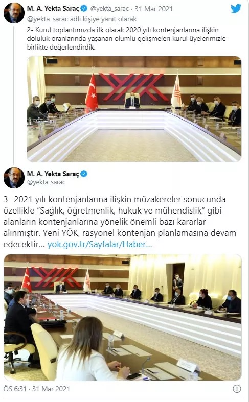"Kurul toplantımızda ilk olarak 2020 yılı kontenjanlarına ilişkin doluluk oranlarında yaşanan olumlu gelişmeleri kurul üyelerimizle birlikte değerlendirdik. 2021 yılı kontenjanlarına ilişkin müzakereler sonucunda özellikle sağlık, öğretmenlik, hukuk ve mühendislik gibi alanların kontenjanlarına yönelik önemli bazı kararlar alınmıştır. Yeni YÖK, rasyonel kontenjan planlamasına devam edecektir."