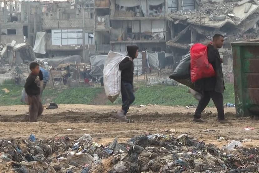 Kış koşulları Gazze Şeridi’ni sert vuruyor; Han Yunus’un Muwasi bölgesinde aileler, ateş yakabilmek için plastik ve kağıt bulmak amacıyla çöpleri karıştırıyor.