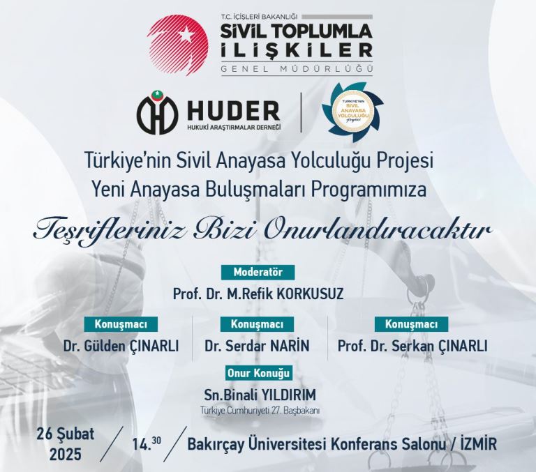 Hukuki Araştırmalar Derneği ve Sivil Toplumla İlişkiler Genel Müdürlüğü İşbirliği ile düzenlenen Türkiye’nin sivil anayasa yolculuğu projesi, Yeni Anayasa İzmir buluşması program akışı 26 Şubat’ta Bakırçay Üniversitesi Konferans salonunda gerçekleştirilecek.
