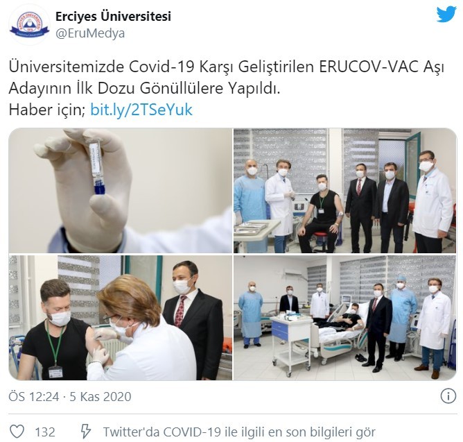 Sosyal medya hesabından yapılan paylaşımda Erciyes Üniversitesinde yeni tip koronavirüse (Kovid-19)'a karşı geliştirilen "ERUCOV-VAC" aşı adayının ilk dozunun bir gönüllüye uygulandığı bildirildi.