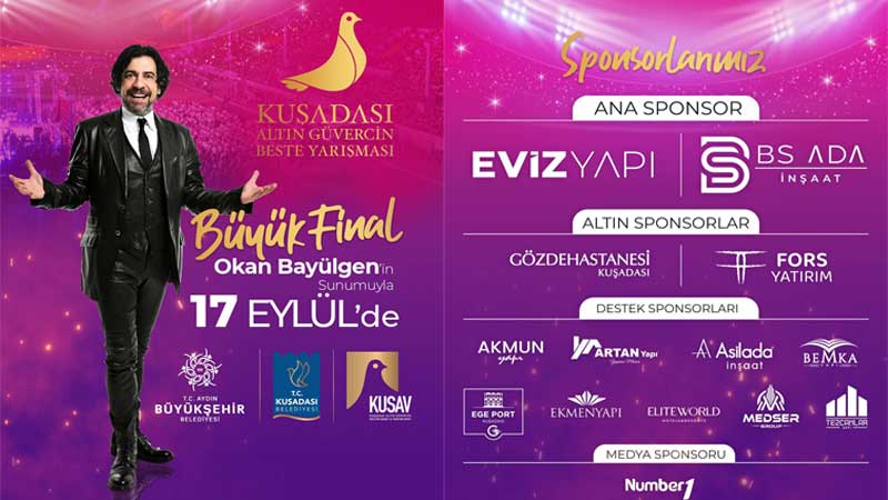 Aydın Büyükşehir Belediyesi, Kuşadası Belediyesi ve Kuşadası Altın Güvercin Kültür Sanat ve Tanıtım Vakfı (KUSAV) iş birliğiyle, Eviz Yapı ve BS Ada İnşaat’ın ana sponsorluğunda bu yıl 26’ncı kez düzenlenen Türkiye’nin pop müzik alanında gelenekselleşen ilk ve tek beste yarışması olan Altın Güvercin için geri sayım başladı. Kuşadası Altın Güvercin Beste Yarışması, 14 Eylül’de Tarihi Kervansaray’da düzenlenecek basın toplantısı ve finalistlerin sahneye çıkış sıralarını belirleyecek olan kura çekimi ile başlayacak. Altın Güvercin kapsamında 16 Eylül gecesi İsmail Cem Dostluk ve Barış Meydanı’nda sevilen pop müzik sanatçısı Melek Mosso bir konser verecek.