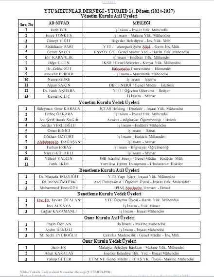 YTÜ Mezunlar Derneği - YTÜMED 14.Dönem (2024-2027) Yönetim Kurulu Üyeleri