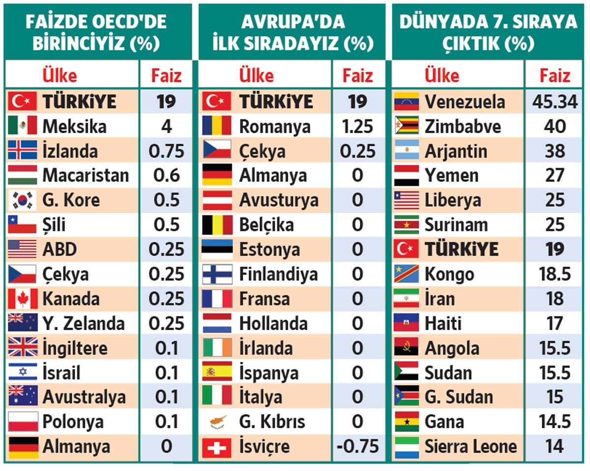 Son artırımla beraber Türkiye yüzde 19 ile dünyada politika faizi en yüksek 7 ülke arasına girdi. Haiti ile aynı seviyeye geldi. Dünyada en yüksek politika faizine sahip ülke yüzde 38.76 ile Venezuela. Bu ülkeyi yüzde 36 ile Arjantin ve yüzde 35 ile Venezuela takip ediyor.