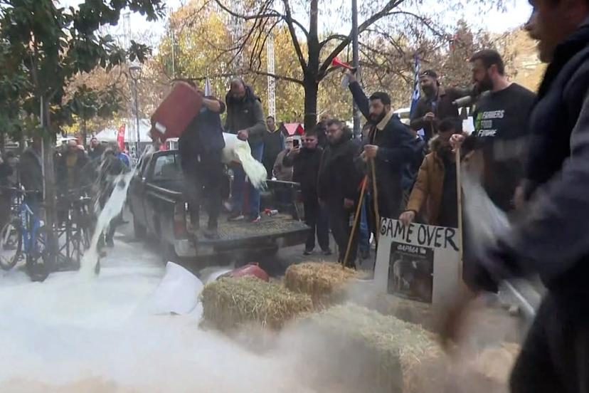 Larisa'da hayvancılıkla uğraşan çiftçiler kente girerek hükümet politikalarına duydukları tepkiyi göstermek için süt ve buğday döktü.
