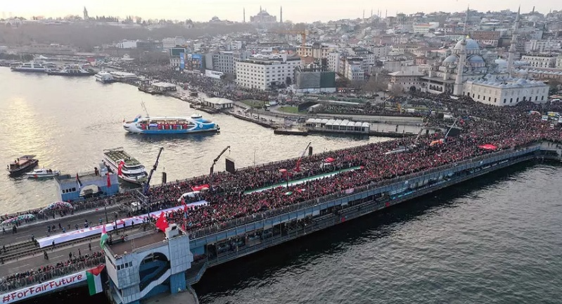 Türkiye Gençlik Vakfının (TÜGVA) öncülüğünde, Milli İrade Platformu tarafından 308 STK'nin katılımıyla "Dünyayı Uyandırıyoruz", "Dün Ayasofya, bugün Emevi, yarın Aksa" ve "Bir Güneş Doğuyor" sloganlarıyla düzenlenen etkinliği için sabah namazında camilerde bir araya gelen on binlerce katılımcı kortejle Galata Köprüsü'ne yürüyüş gerçekleştirdi.