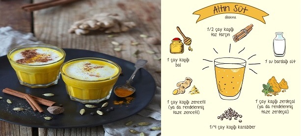 Aktarlarda yada baharat reyonlarında görüp önünden geçtiğiniz zerdeçal, çocukluğumuzdan bu yana beslenmemizde önemli bir yeri olan süt... Çok tanıdık iki malzemenin buluşmasından ortaya muhteşem bir mucize çıkıyor. Üzerine şu zamana kadar çektiğimiz mide ve bağırsak problemlerini, gribi, uyku sorunlarınızı, bağışıklık sistemi problemlerinizi, bir türlü verilmeyen kilolarınızı ve daha birçok probleminizi çözebilecek güçte diye de ekleyelim.