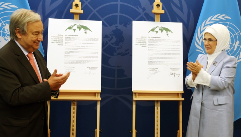 BM Genel Sekreteri Guterres ile “çok verimli bir görüşme” gerçekleştirdiklerine işaret eden Emine Erdoğan, “Kendisi, Türkiye'nin Sıfır Atık Projesi'ni yakından takip ettiğini ve destek verdiğini belirtti. Bu görüşmeden çıkan sinerjiyle somut adımlar atma kararı alarak tarihi bir metni imzaladık. İmzalanan iyi niyet beyanının, dünyada yeni bir başlangıç olacağına inanıyorum.” Diyen Emine Erdoğan, Türkiye de başlattığı “sıfır atık” projesi BM tarafından izlenmesi ve desteklenmesi, Dünya ülkelerinin rol model olarak görmesi, bizim için Türkiye için çok önemlidir…