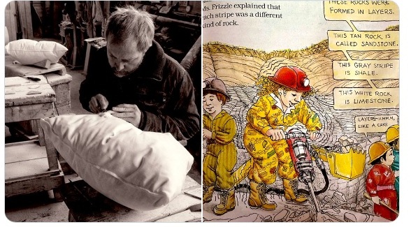 Yüksek basınçla sıkıştırılmış bu malzemeyi de anlamam bizimkilerin çocuk kitabı var, Magic School Bus— o serideki- bir öğretmen, Bayan Frizzle sayesinde oldu. Onun meşhur gezilerinden biri dünyanın merkezine bir yolculuktu. Orada bütün taşları tanıtmışlardı. Mermerin ana vatanından gelip, çocuk kitaplarından taş çeşitlerini öğrenen ben, epey hayıflanmıştım. Dünya mantoları üst üste giymiş bir kocakarı gibi! Soy soy bitmez. En üstte; Toprak, humuslu, killi ve canlı artıklarından oluşuyor. Altında : Kayalıklar başlıyor. Turuncumsu olan ‘kumlu toprak’ sert, Sonra derine indikçe grileşiyor, basınç arıyor, ‘Shale’ diyorlar burada, bilemedim Türkçe’sini; İnce bir katman, içinde deniz kabuğu o bu var… İniyoruz bir tık daha derine; ‘Kalkerli’ diye hatırladığımız, Beyaz daha da sert kayalıklar başlıyor. Fosil mağaraları bulunur— işte onlar Kalkerden oluşuyor…