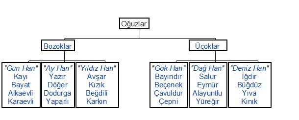Türk-Oğuz geleneklerine göre idarî ve sosyal teşkilat, ikili bir yapı oluşturmaktaydı. Bu geleneğe uygun olarak Oğuzlar, Bozoklar ve Üçoklar olmak üzere on ikişer boydan iki ana kola ayrılmışlardı. Her boyun, idarî ve sosyal mevkilerini yansıtan orun ve ongunları vardı. Yine Oğuz geleneklerine göre Bozoklar hâkim unsur, Üçoklar ona tâbiydi.