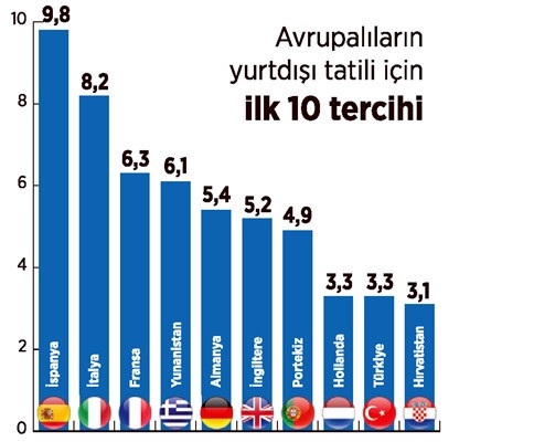 Avrupa Seyahat Komisyonu (ETC) raporuna göre bu yıl az sayıda da olsa yurtdışına yapılacak seyahatlerde ilk 10 ülke tercihleri sıralamasında İspanya birinci sırada, Türkiye 9. Sırada