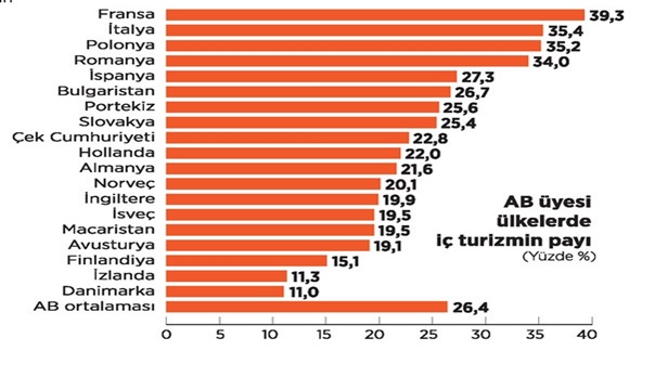 Seyahat pazarının merkezi olan Avrupa'da turizmde öne çıkan ülkeler iç pazarı da güçlü olan ülkeler. Avrupa Birliği (AB) İstatistik Bürosu (Eurostat) verilerine göre Fransa, iç turizmde yüzde 39 pay ile ilk sırada yer alıyor. Dört ve daha uzun süreli tatile çıkanların yüzde 39’u tatilini kendi ülkesinde yapıyor. İç turizmde Fransa’yı İtalya izliyor. İtalya’da da dört ve daha uzun gecelemeli tatillerin yüzde 35’i yurtiçinde gerçekleşiyor. AB üyesi ülkelerde ortalama yüzde 26 olan bu oran en düşük yüzde 11 ile Danimarka’da gerçekleşiyor. Eurostat verilerine göre Danimarka’da dört ve daha uzun gecelemeli tatillerin ancak yüzde 11’i yurt içinde gerçekleşiyor. Amerika’da ise iç turizmin payı çok daha yüksek. Ülkelerin iç turizmdeki durumu koronavirüs salgını nedeniyle daha da büyüyecek.